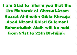 That trustworthy, high ranked & superb personalities endow with precious services for scattering the luminosity of Islam in the subcontinent (pak-o-hind) to point up off track muslims the right alleyway and to incline new muslims towards Islam that even after long time the relics of their eminent personalities are preserved within the hearts of Muslimanany-hind, among them few esteemed siants are: “Sultan-al-hind khwaja-khwajgan Hazrat Khwaja Gharib nawaz Moeen-ud-Din Hassan sajzi chisti Ajmeeri, Shiekh-ul-islam-walmuslameen Hazrt Baba Fareed-ud-din masood Gangshakar, Hazrat Mehboob-illahi Nizam-ud-din dehalvi, Hazrat Qibla-alam Khwaja Noor Muhammad Maharvi , Hazrat Hafiz Muhammad Jamal-ullah multani, Hazrat Peer Pathan Khwaja muhammad suleman tonsvi, Hazrat Khwaja Qibla Allah Baksh tonswi, Hazrat Khwaja khuda baksh kherpori, Hazrat Khwaja Muhammad Abdur-Razzak Kherpori and specially Hazrat Sultan-ul-olia Al-shiekh Qibla Allama Asad Nizami chisti sulemani qudis sirham are included”.
